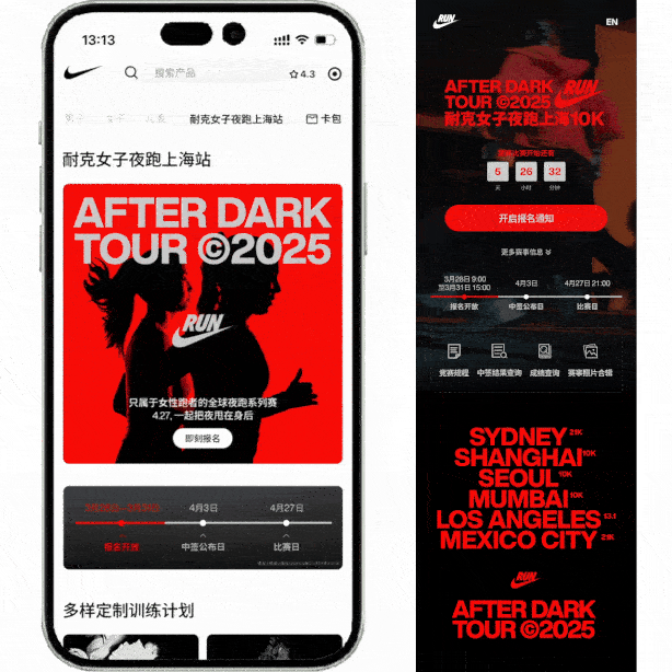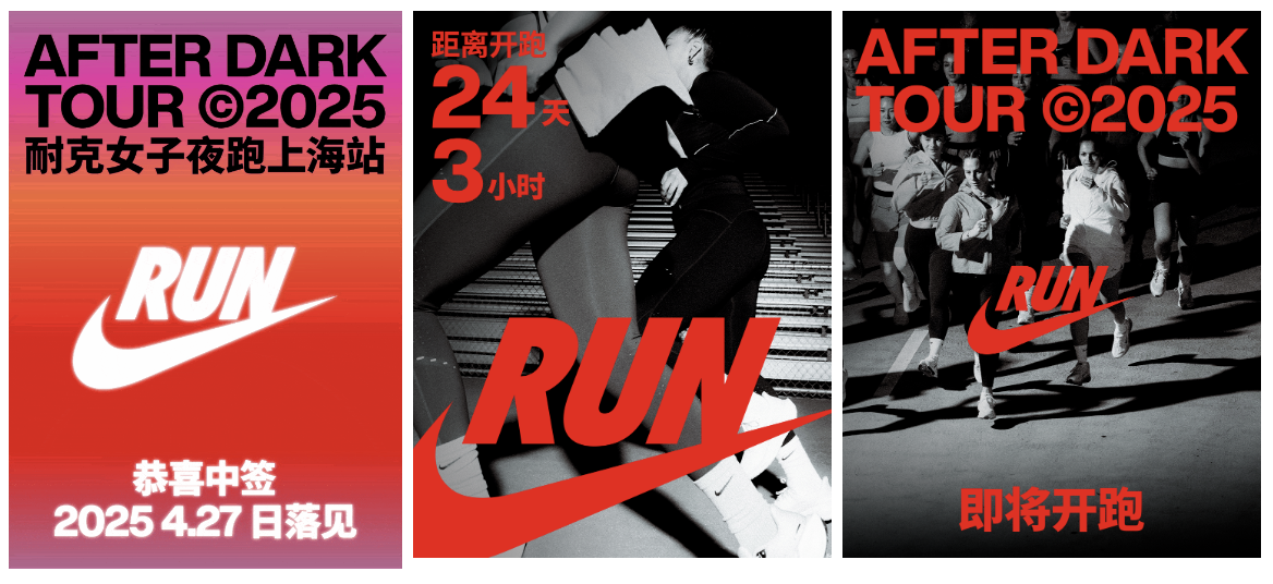 去年 11 月底,我们收到了来自老朋友 Nike 的 Brief:2025 年,Nike 将在全球 6 个城市举办 Nike After Dark Tour 女子夜跑系列赛,中国的这一场将在 4 月落地上海,如何打通链路做线上沟通和传播,让更多跑者了解赛事并参与其中。