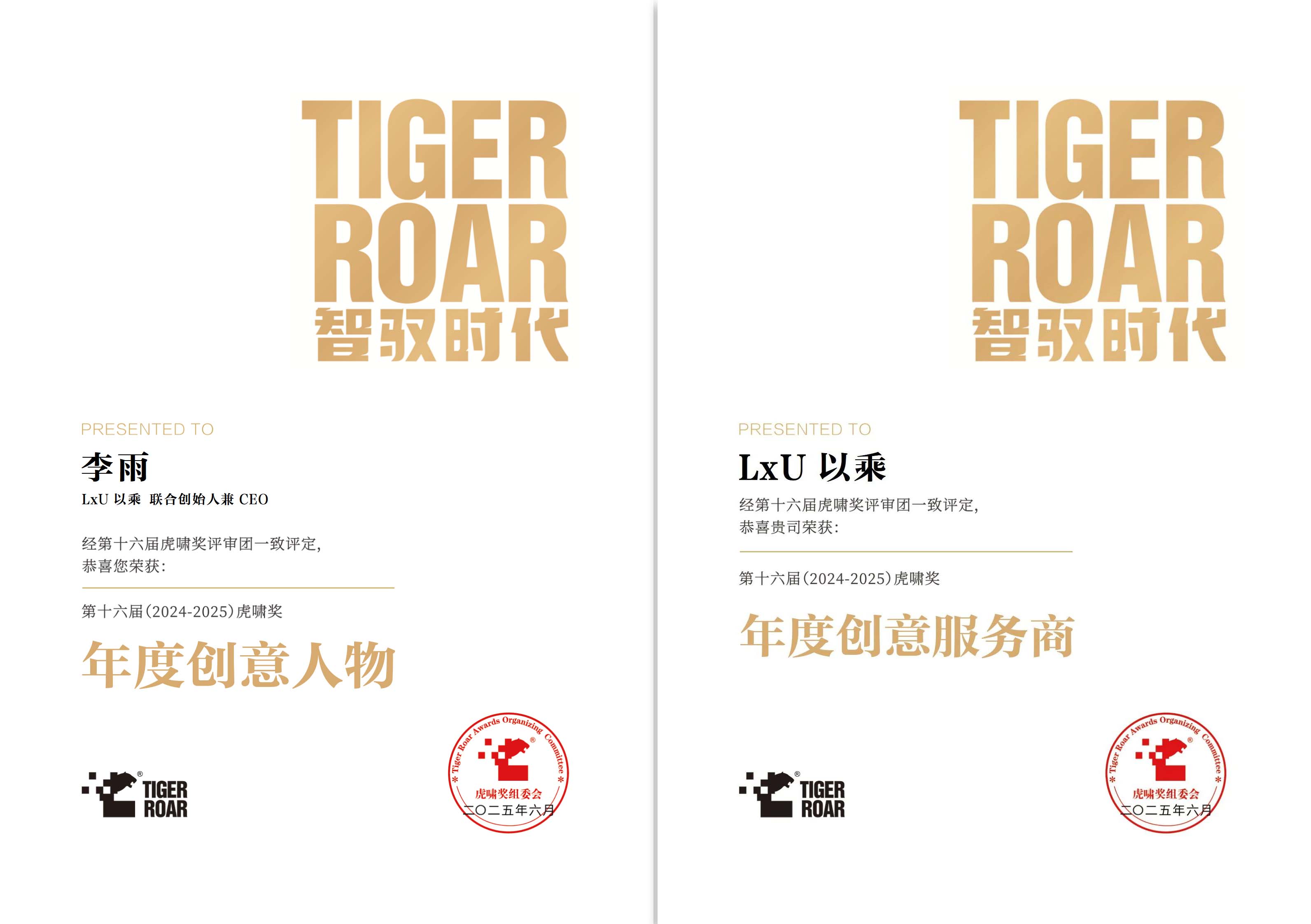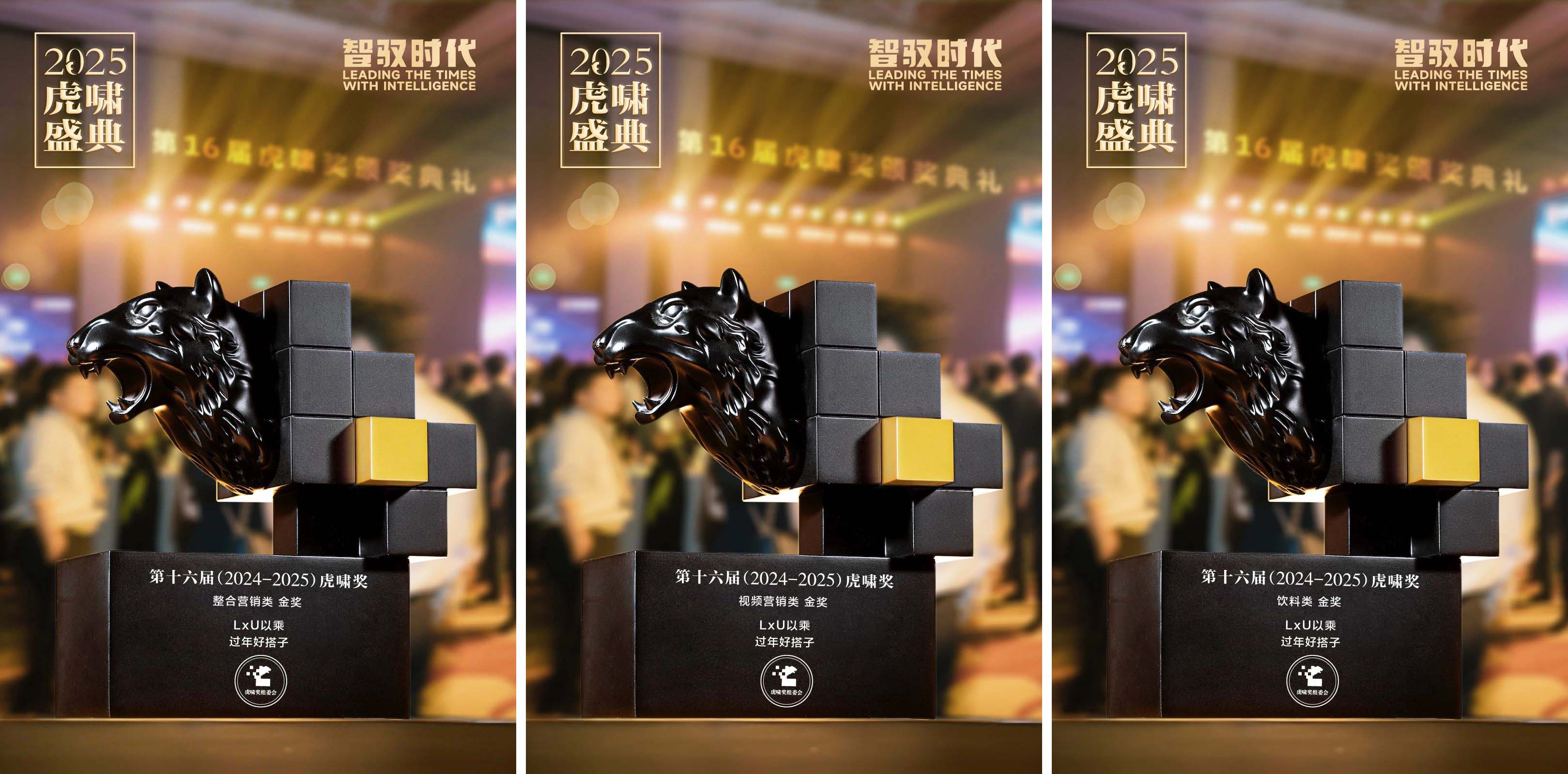 虎啸奖一举收获整合营销金奖、视频营销类金奖、饮料类金奖 3 枚重量级金奖,同时LxU以乘荣获“年度创意服务商”、LxU以乘 CEO & 联合创始人李雨荣获“年度创意人物”荣誉称号!