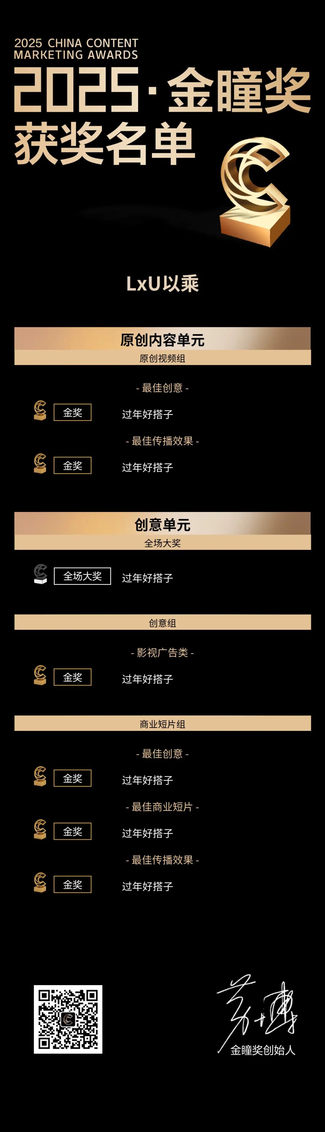 恭喜 LxU以乘为伊利品牌打造的过年好搭子实力捧回 6 枚重量级金奖,并斩获 2025 年金瞳奖「创意单元全场大奖」!