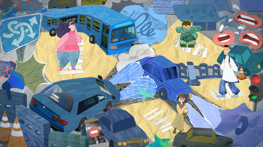 过马路的场景中,我们运用了蒙太奇的处理手法。