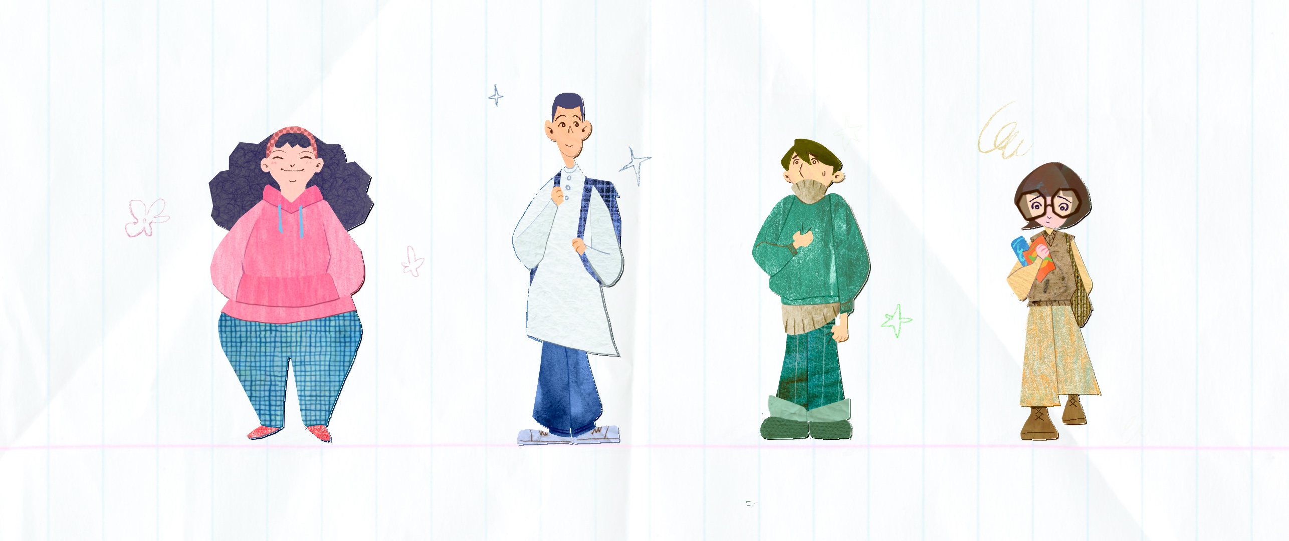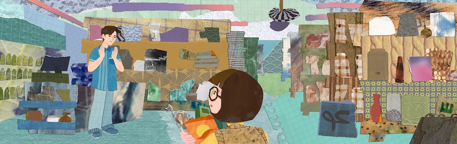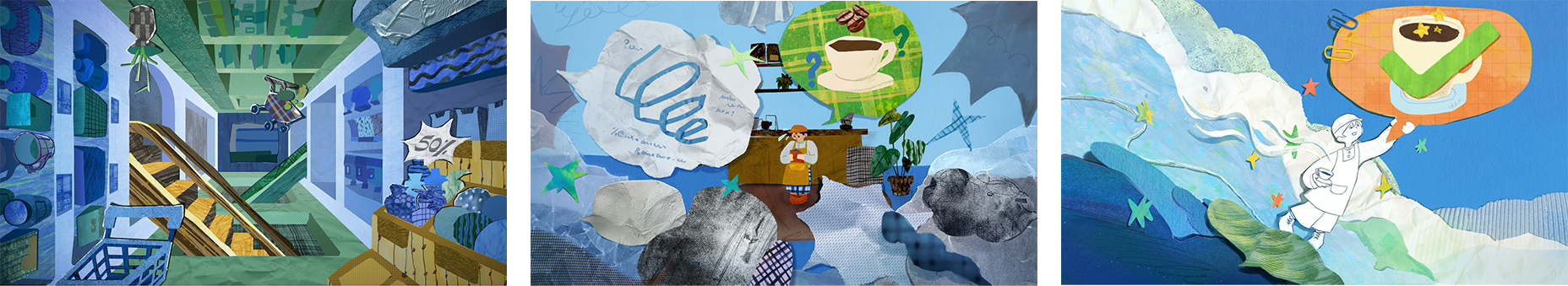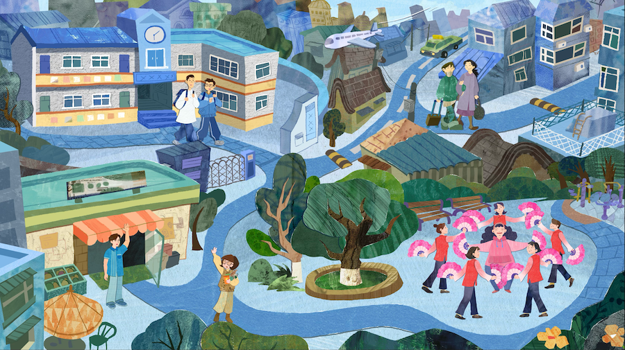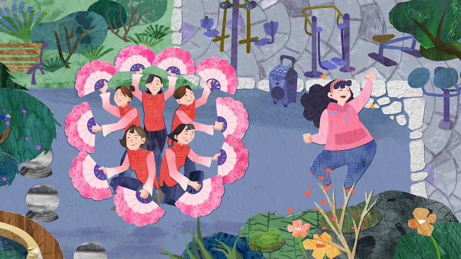 拼贴能把各种材料、风格组合在一起。我们保留了手工的温度,纸张边缘的不规则变化,纹理的区别,不同材质色彩的叠加,共同形成美好且层次丰富的视觉感受。就像在片中看似不一样的人们,有着不同的表达方式,但是在社区里彼此连接,相互包容,拼在一起,最终组成了一个温暖的画面。