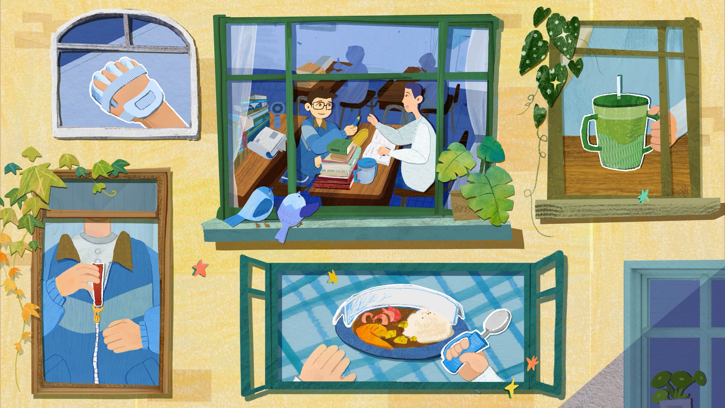 画面是彩铅手绘风格的插画,铅笔笔触描绘出心伙伴自主自在生活在社区中的场景,展现出他们的快乐、自由。保留的手绘笔划的痕迹,给人一种温暖而柔软的感觉。