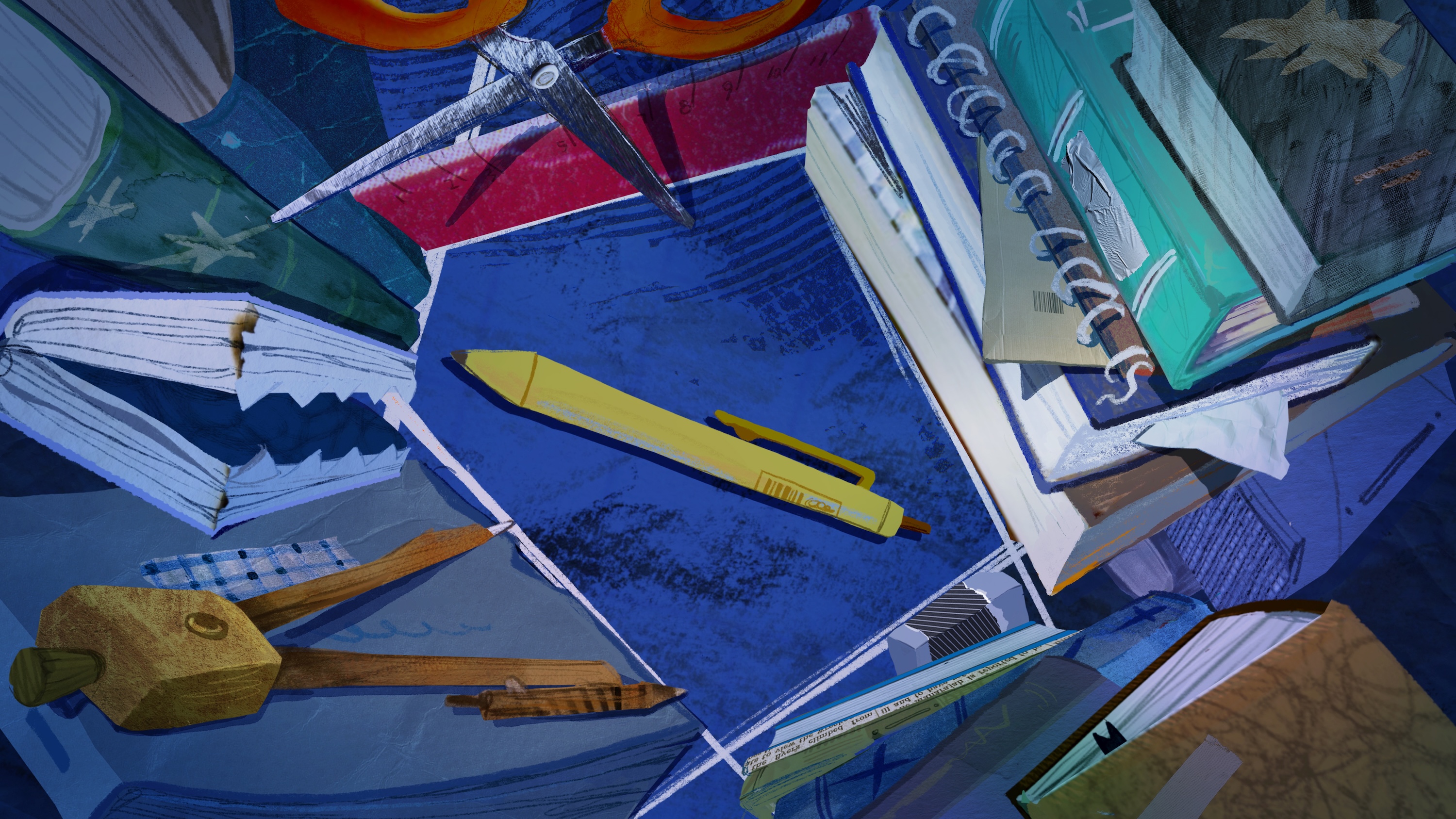 随着笔越滚越远,类似的场景也叠加出现,代表着掉落的次数之多。画面逐渐变暗,他的尴尬和失落也不断累积,氛围变得更加压抑。