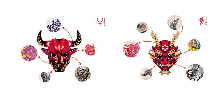 翻阅了数不清的资料参考后,将可用的元素范围逐步缩小,不断地讨论和尝试如何将多种中国传统艺术形式的元素恰到好处地应用到十二生肖的面具设计中。