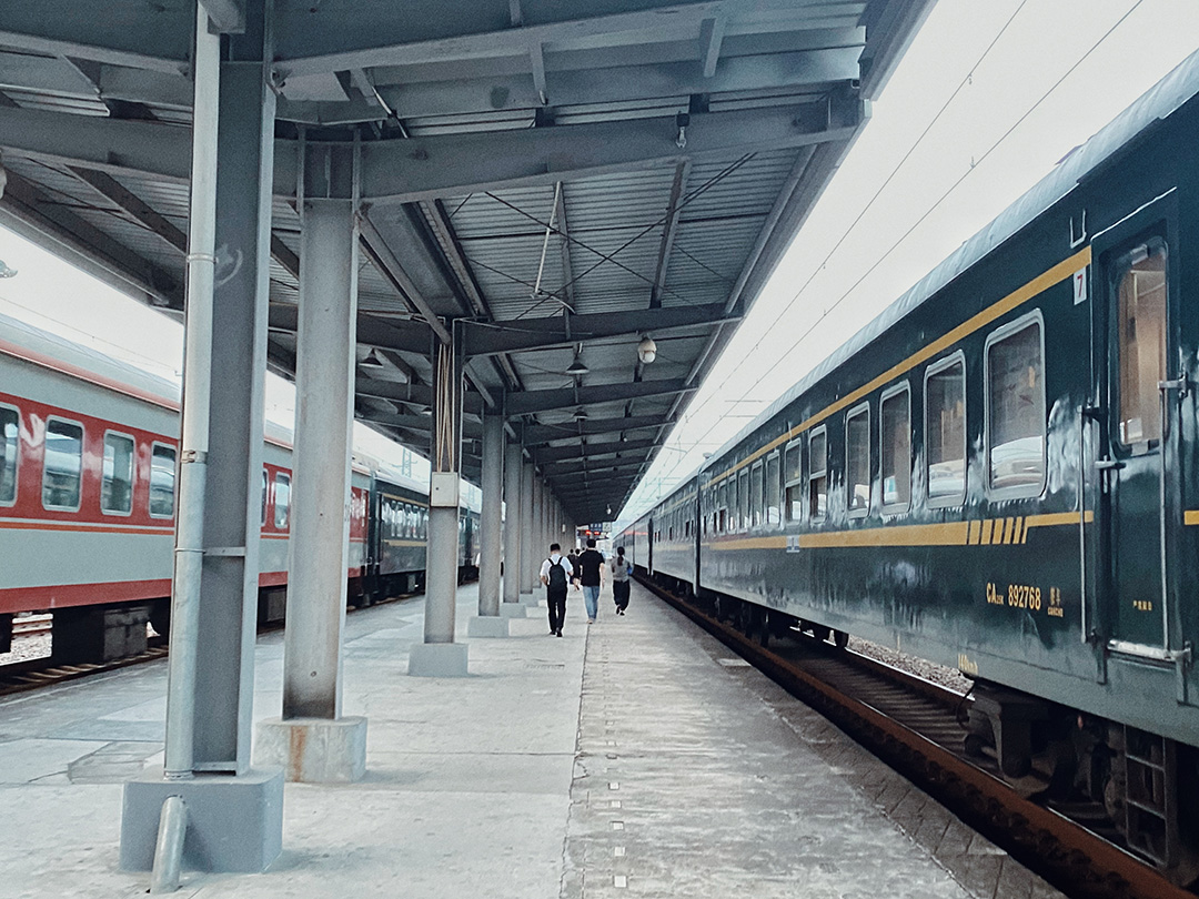 异常干净的火车站台,有好久不见的绿皮火车呜呜飞过