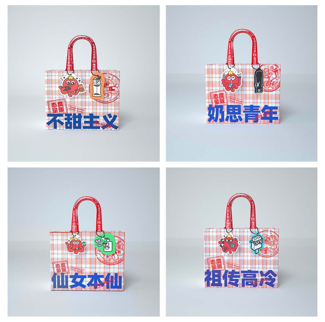 我们采用了经典红白蓝编织袋的材质,在此基础上将参与的几个品牌及产品特征与时下年轻人爱用的高频网络热梗结合。