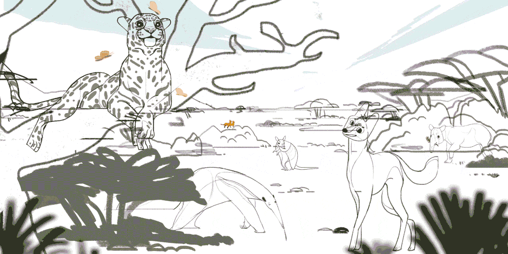 在创作过程中,我们注意每个小动物周围环境的一些细微区别,尽量还原它们所生活区域的真实风貌。两种森林之间也从色调上做了较为明显的区分。还在背景中加入了一些其他小动物,呈现森林的生物多样性与生机。