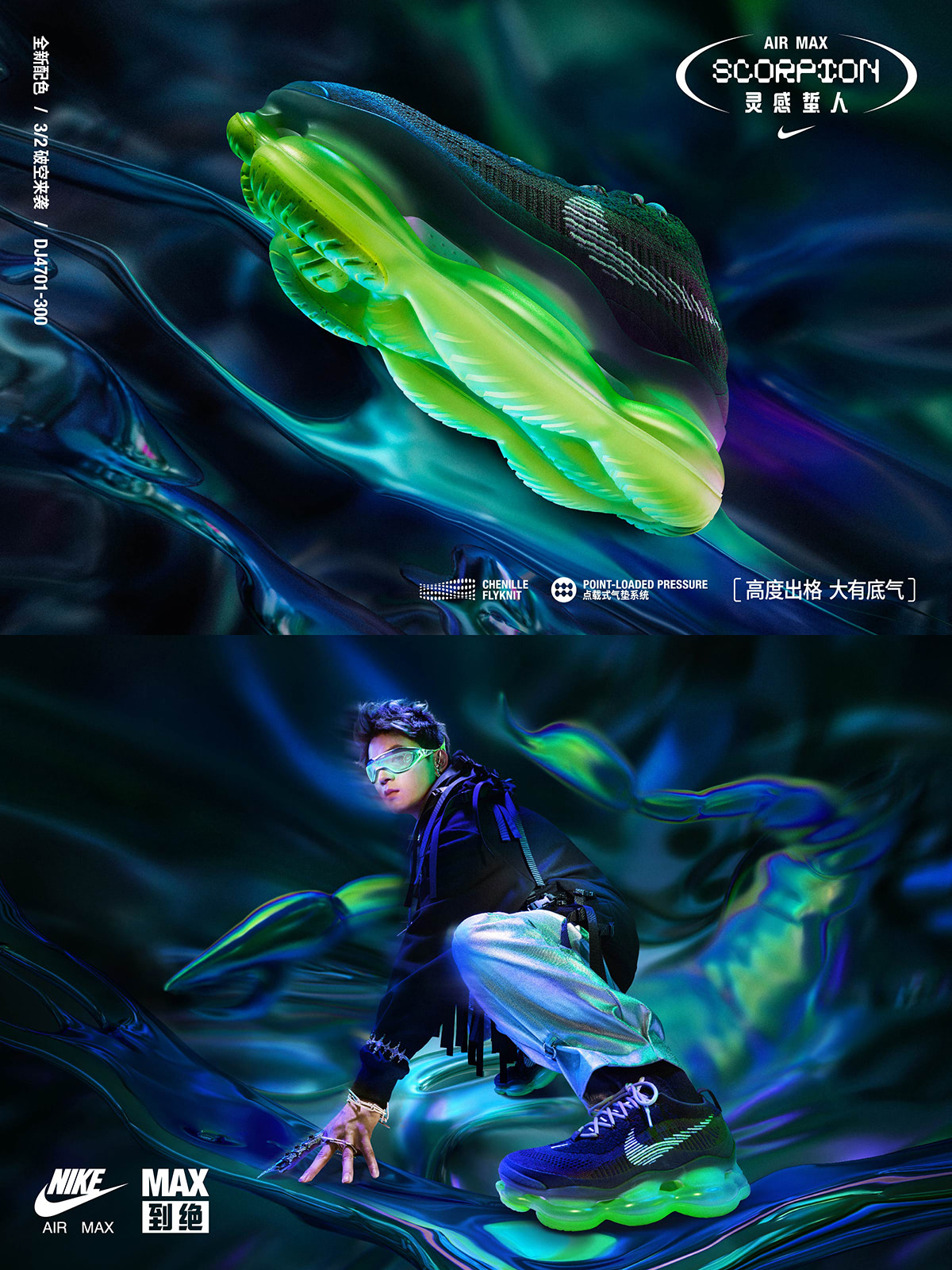 为了更好地展现这份精神,Nike 还邀请到了两位同样敢于突破的艺术家,他们以 Air Max Scorpion 为灵感,发挥想象,大胆去造。